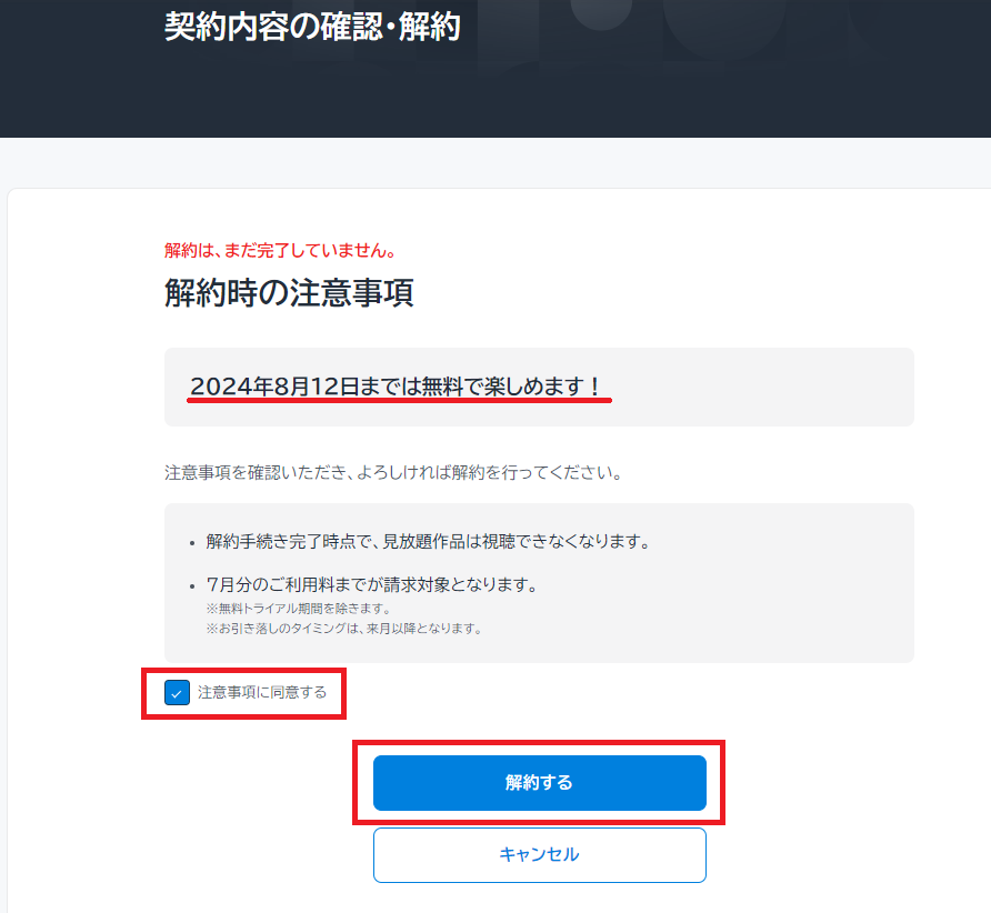 解約時の注意事項が表示されます。